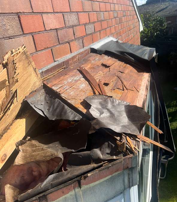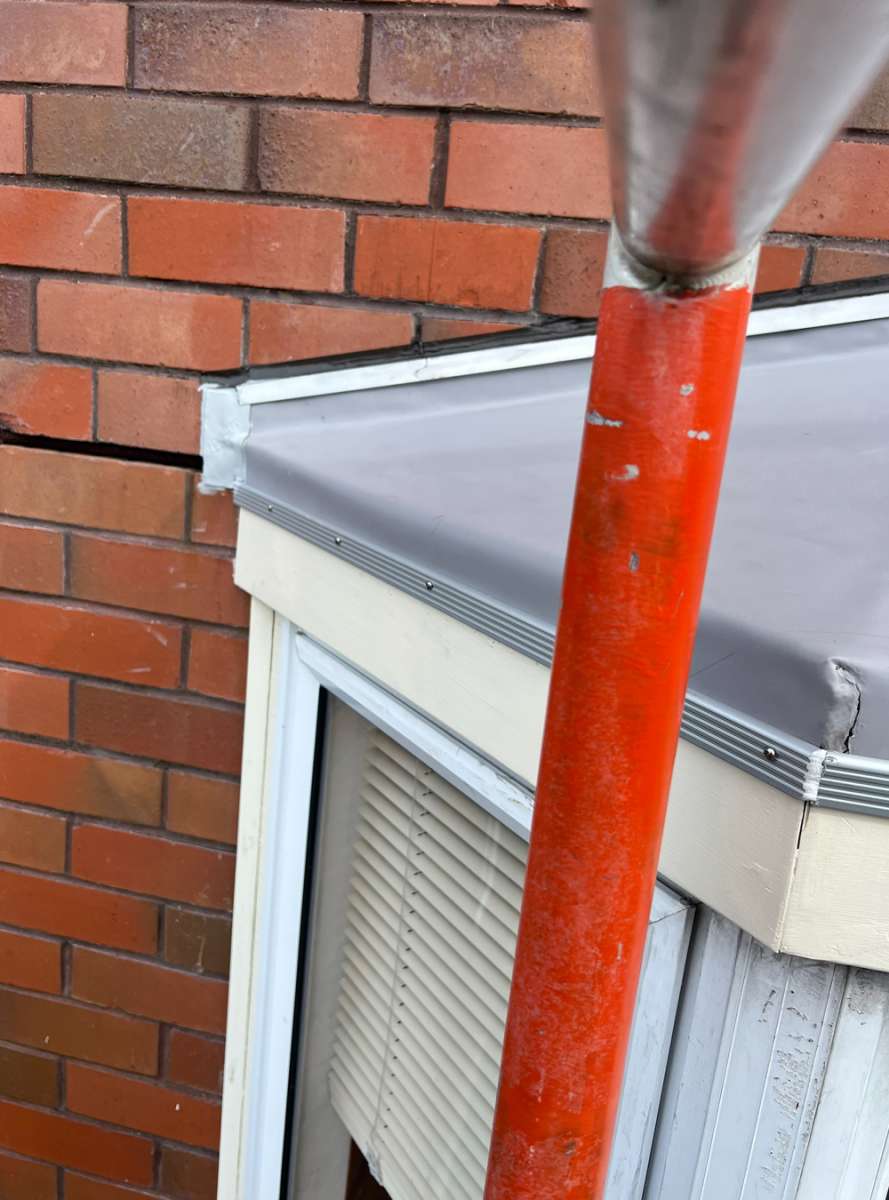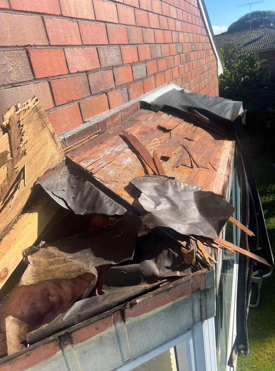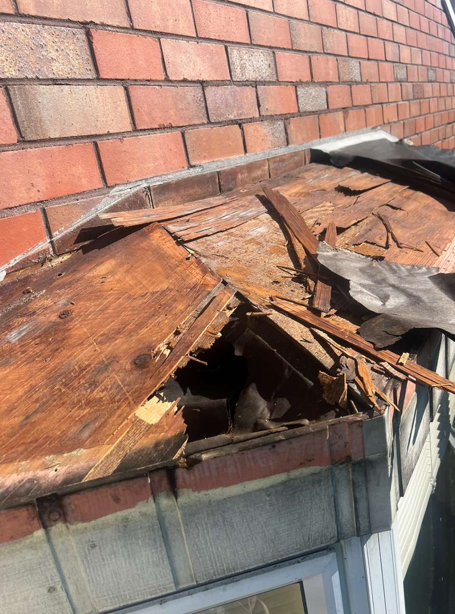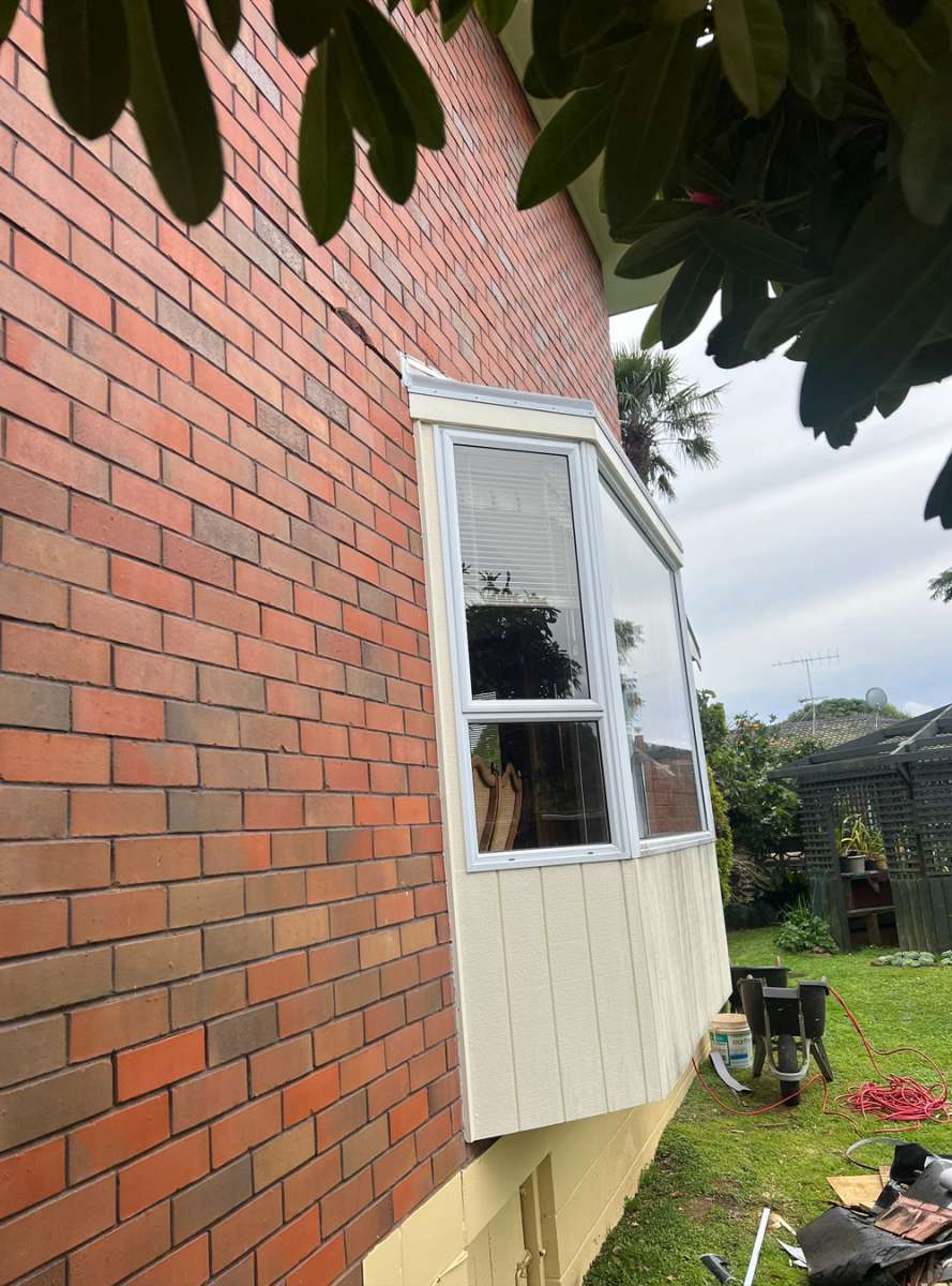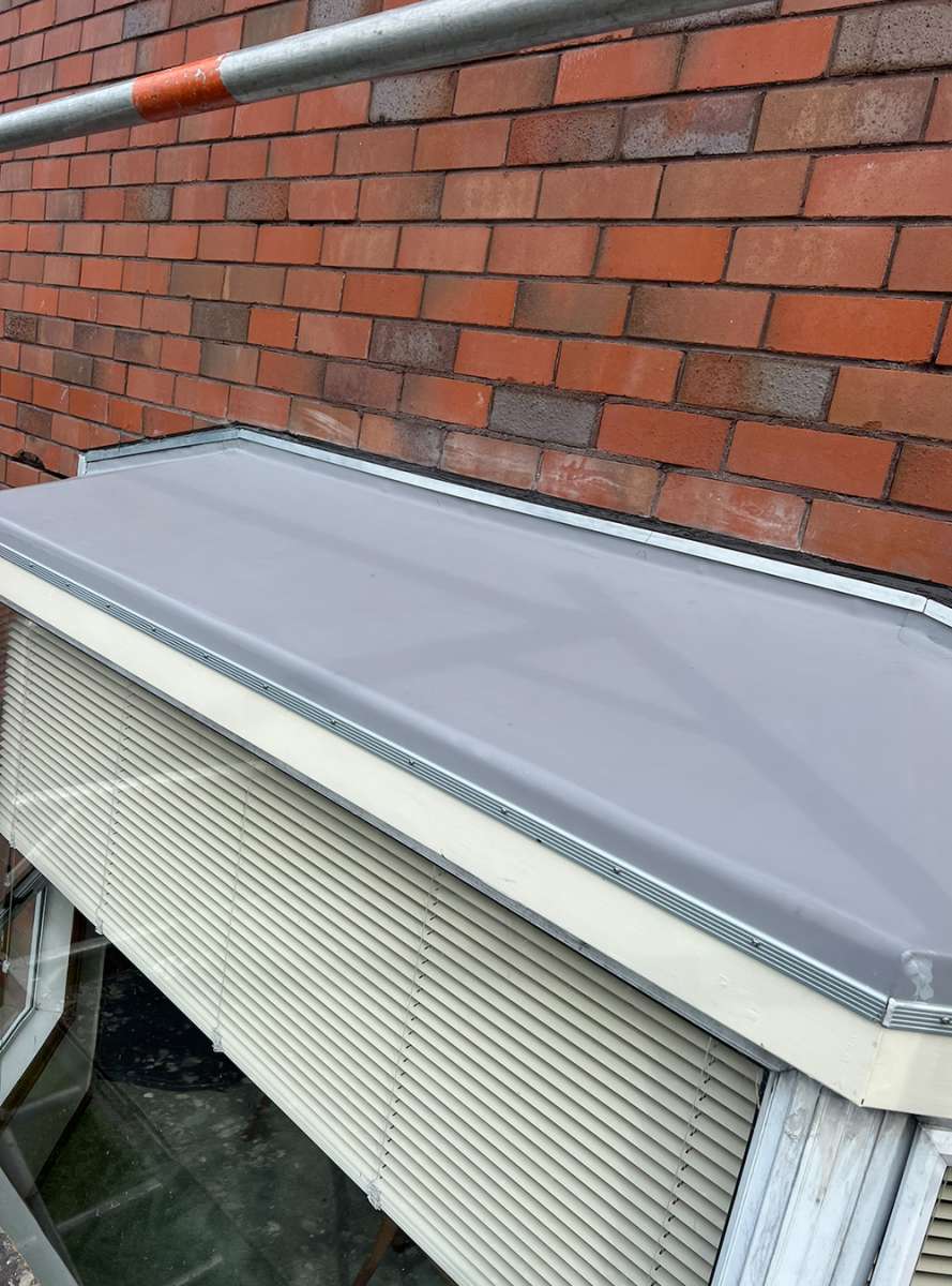 Hillcrest, North Shore job before and after Small bay window roof replacement Grey TPO New plywood new fascia new chase flashing and sealant.